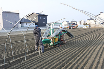 10月上旬から種まきをおこなって、トンネルハウスを設置し種まきから50日~70日後に土寄せをおこない、その70日~80日後に収穫を迎えます